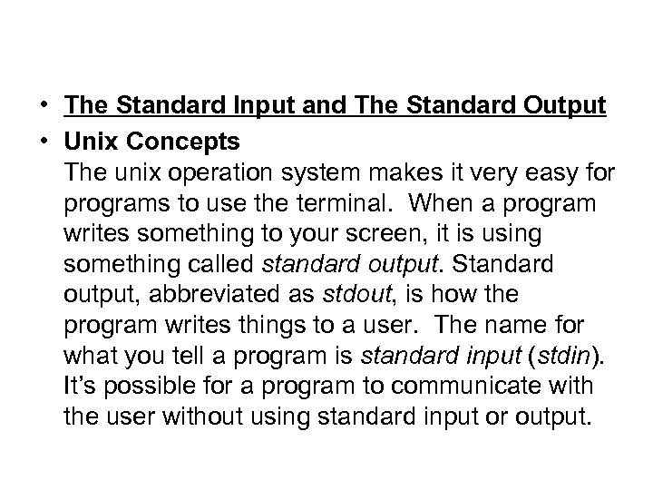 • The Standard Input and The Standard Output • Unix Concepts The unix operation system makes it very easy for programs to use the terminal. When a program writes something to your screen, it is using something called standard output. Standard output, abbreviated as stdout, is how the program writes things to a user. The name for what you tell a program is standard input (stdin). It’s possible for a program to communicate with the user without using standard input or output.