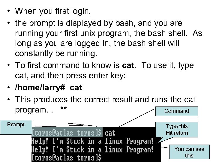 • When you first login, • the prompt is displayed by bash, and you are running your first unix program, the bash shell. As long as you are logged in, the bash shell will constantly be running. • To first command to know is cat. To use it, type cat, and then press enter key: • /home/larry# cat • This produces the correct result and runs the cat program. . ** Command Prompt Type this Hit return You can see this
