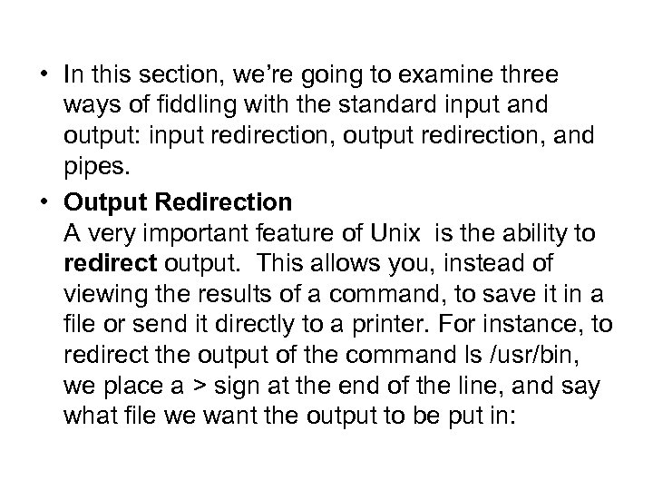 • In this section, we’re going to examine three ways of fiddling with the standard input and output: input redirection, output redirection, and pipes. • Output Redirection A very important feature of Unix is the ability to redirect output. This allows you, instead of viewing the results of a command, to save it in a file or send it directly to a printer. For instance, to redirect the output of the command ls /usr/bin, we place a > sign at the end of the line, and say what file we want the output to be put in: