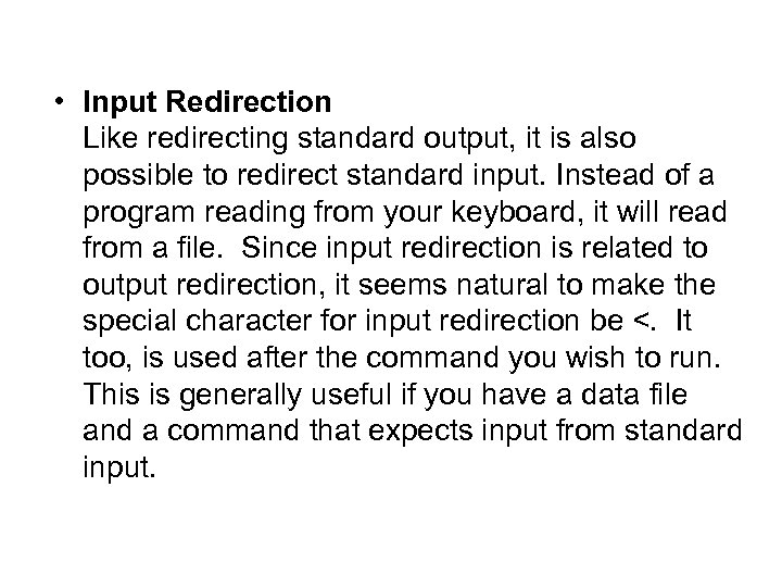 • Input Redirection Like redirecting standard output, it is also possible to redirect standard input. Instead of a program reading from your keyboard, it will read from a file. Since input redirection is related to output redirection, it seems natural to make the special character for input redirection be <. It too, is used after the command you wish to run. This is generally useful if you have a data file and a command that expects input from standard input.