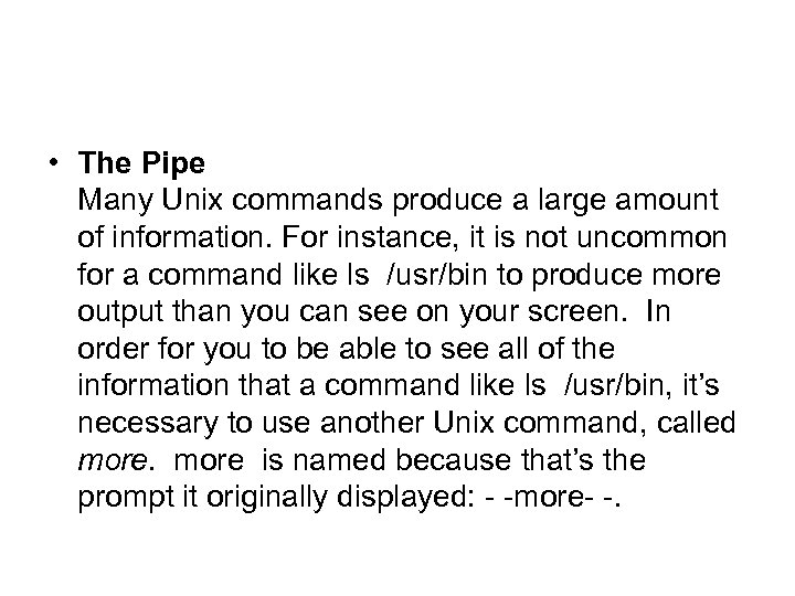 • The Pipe Many Unix commands produce a large amount of information. For instance, it is not uncommon for a command like ls /usr/bin to produce more output than you can see on your screen. In order for you to be able to see all of the information that a command like ls /usr/bin, it’s necessary to use another Unix command, called more is named because that’s the prompt it originally displayed: - -more- -.