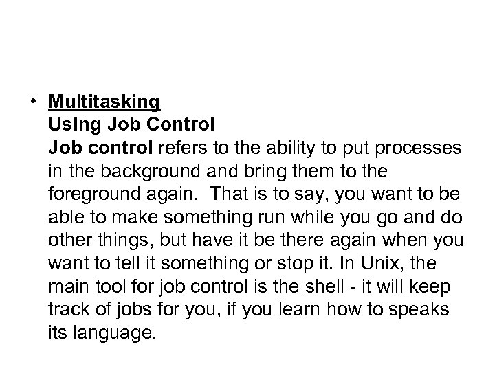 • Multitasking Using Job Control Job control refers to the ability to put processes in the background and bring them to the foreground again. That is to say, you want to be able to make something run while you go and do other things, but have it be there again when you want to tell it something or stop it. In Unix, the main tool for job control is the shell - it will keep track of jobs for you, if you learn how to speaks its language.