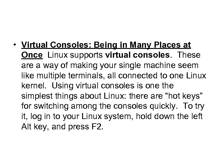• Virtual Consoles: Being in Many Places at Once Linux supports virtual consoles. These are a way of making your single machine seem like multiple terminals, all connected to one Linux kernel. Using virtual consoles is one the simplest things about Linux: there are “hot keys” for switching among the consoles quickly. To try it, log in to your Linux system, hold down the left Alt key, and press F 2.