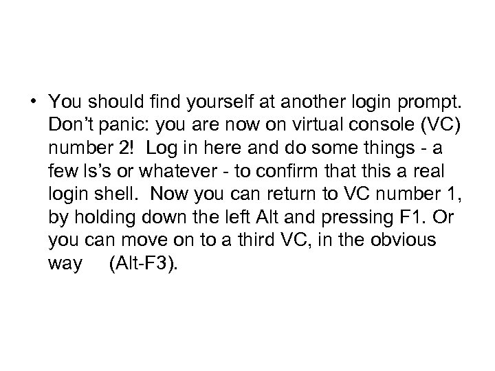 • You should find yourself at another login prompt. Don’t panic: you are now on virtual console (VC) number 2! Log in here and do some things - a few ls’s or whatever - to confirm that this a real login shell. Now you can return to VC number 1, by holding down the left Alt and pressing F 1. Or you can move on to a third VC, in the obvious way (Alt-F 3).
