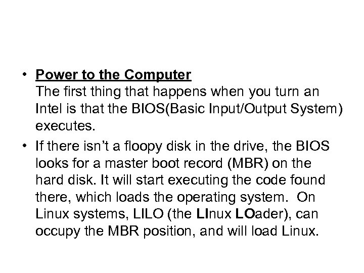 • Power to the Computer The first thing that happens when you turn an Intel is that the BIOS(Basic Input/Output System) executes. • If there isn’t a floopy disk in the drive, the BIOS looks for a master boot record (MBR) on the hard disk. It will start executing the code found there, which loads the operating system. On Linux systems, LILO (the LInux LOader), can occupy the MBR position, and will load Linux.