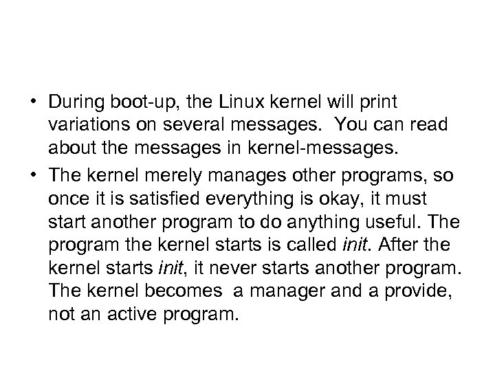 • During boot-up, the Linux kernel will print variations on several messages. You can read about the messages in kernel-messages. • The kernel merely manages other programs, so once it is satisfied everything is okay, it must start another program to do anything useful. The program the kernel starts is called init. After the kernel starts init, it never starts another program. The kernel becomes a manager and a provide, not an active program.