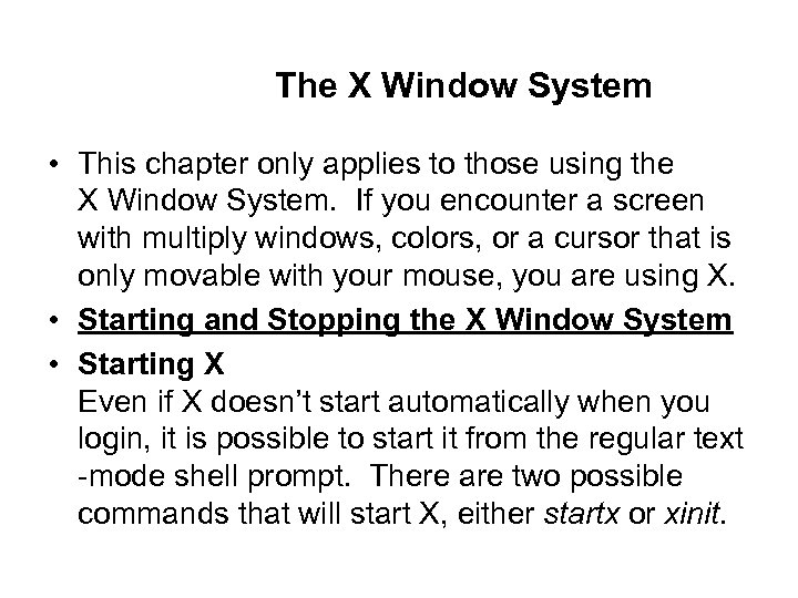 The X Window System • This chapter only applies to those using the X Window System. If you encounter a screen with multiply windows, colors, or a cursor that is only movable with your mouse, you are using X. • Starting and Stopping the X Window System • Starting X Even if X doesn’t start automatically when you login, it is possible to start it from the regular text -mode shell prompt. There are two possible commands that will start X, either startx or xinit.