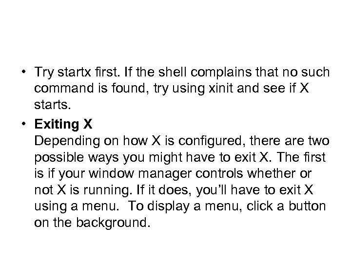 • Try startx first. If the shell complains that no such command is found, try using xinit and see if X starts. • Exiting X Depending on how X is configured, there are two possible ways you might have to exit X. The first is if your window manager controls whether or not X is running. If it does, you’ll have to exit X using a menu. To display a menu, click a button on the background.