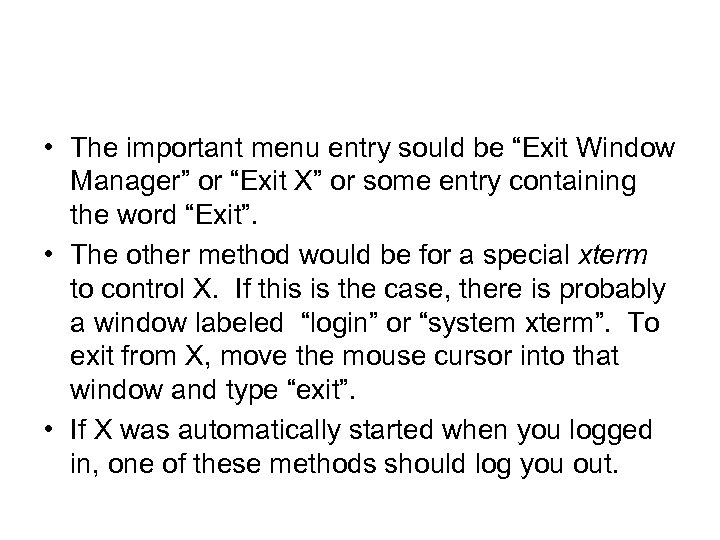 • The important menu entry sould be “Exit Window Manager” or “Exit X” or some entry containing the word “Exit”. • The other method would be for a special xterm to control X. If this is the case, there is probably a window labeled “login” or “system xterm”. To exit from X, move the mouse cursor into that window and type “exit”. • If X was automatically started when you logged in, one of these methods should log you out.