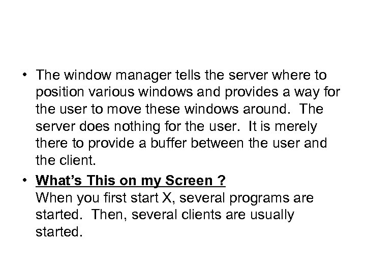 • The window manager tells the server where to position various windows and provides a way for the user to move these windows around. The server does nothing for the user. It is merely there to provide a buffer between the user and the client. • What’s This on my Screen ? When you first start X, several programs are started. Then, several clients are usually started.