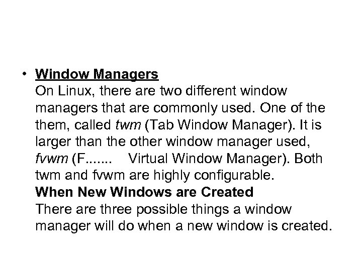 • Window Managers On Linux, there are two different window managers that are commonly used. One of them, called twm (Tab Window Manager). It is larger than the other window manager used, fvwm (F. . . . Virtual Window Manager). Both twm and fvwm are highly configurable. When New Windows are Created There are three possible things a window manager will do when a new window is created.