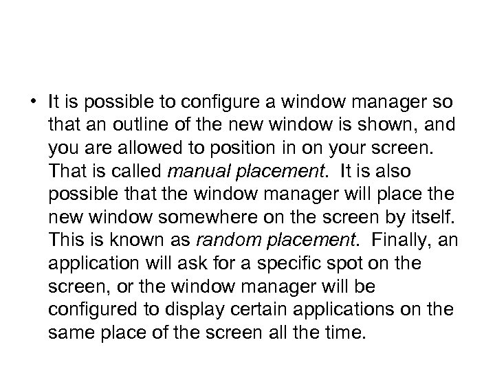 • It is possible to configure a window manager so that an outline of the new window is shown, and you are allowed to position in on your screen. That is called manual placement. It is also possible that the window manager will place the new window somewhere on the screen by itself. This is known as random placement. Finally, an application will ask for a specific spot on the screen, or the window manager will be configured to display certain applications on the same place of the screen all the time.
