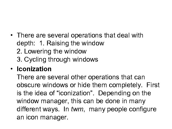 • There are several operations that deal with depth: 1. Raising the window 2. Lowering the window 3. Cycling through windows • Iconization There are several other operations that can obscure windows or hide them completely. First is the idea of “iconization”. Depending on the window manager, this can be done in many different ways. In twm, many people configure an icon manager.