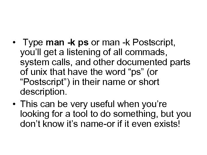• Type man -k ps or man -k Postscript, you’ll get a listening of all commads, system calls, and other documented parts of unix that have the word “ps” (or “Postscript”) in their name or short description. • This can be very useful when you’re looking for a tool to do something, but you don’t know it’s name-or if it even exists!