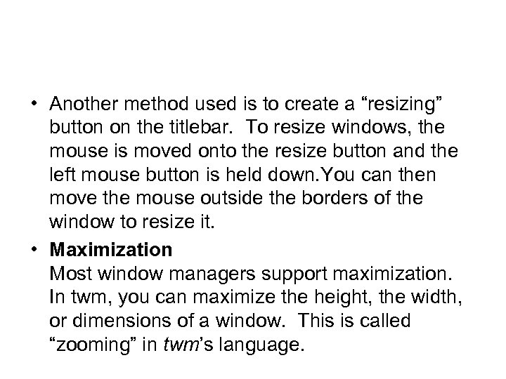• Another method used is to create a “resizing” button on the titlebar. To resize windows, the mouse is moved onto the resize button and the left mouse button is held down. You can then move the mouse outside the borders of the window to resize it. • Maximization Most window managers support maximization. In twm, you can maximize the height, the width, or dimensions of a window. This is called “zooming” in twm’s language.