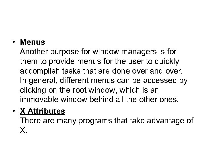 • Menus Another purpose for window managers is for them to provide menus for the user to quickly accomplish tasks that are done over and over. In general, different menus can be accessed by clicking on the root window, which is an immovable window behind all the other ones. • X Attributes There are many programs that take advantage of X.