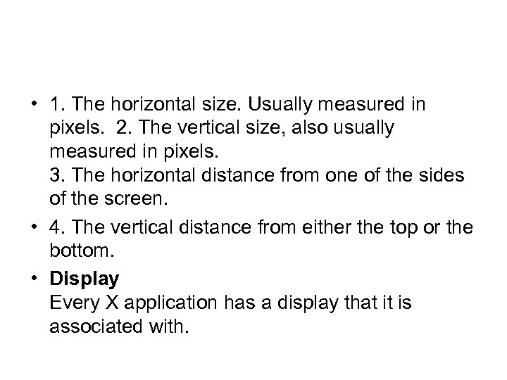 • 1. The horizontal size. Usually measured in pixels. 2. The vertical size, also usually measured in pixels. 3. The horizontal distance from one of the sides of the screen. • 4. The vertical distance from either the top or the bottom. • Display Every X application has a display that it is associated with.