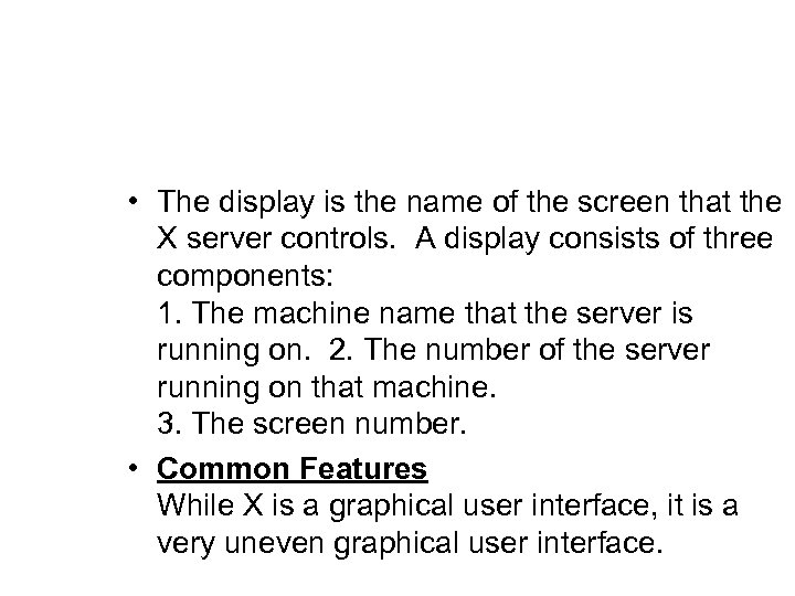 • The display is the name of the screen that the X server controls. A display consists of three components: 1. The machine name that the server is running on. 2. The number of the server running on that machine. 3. The screen number. • Common Features While X is a graphical user interface, it is a very uneven graphical user interface.