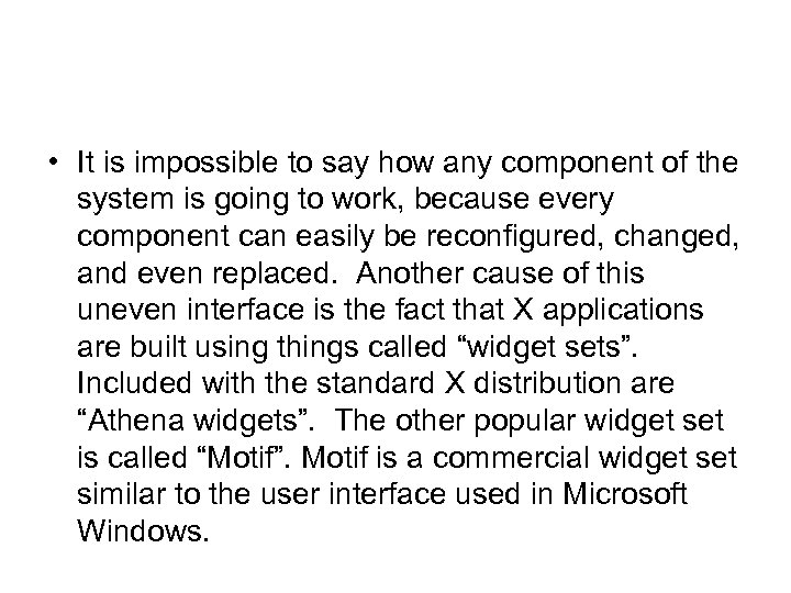 • It is impossible to say how any component of the system is going to work, because every component can easily be reconfigured, changed, and even replaced. Another cause of this uneven interface is the fact that X applications are built using things called “widget sets”. Included with the standard X distribution are “Athena widgets”. The other popular widget set is called “Motif”. Motif is a commercial widget similar to the user interface used in Microsoft Windows.