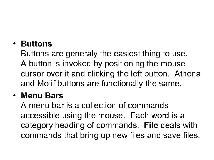 • Buttons are generaly the easiest thing to use. A button is invoked by positioning the mouse cursor over it and clicking the left button. Athena and Motif buttons are functionally the same. • Menu Bars A menu bar is a collection of commands accessible using the mouse. Each word is a category heading of commands. File deals with commands that bring up new files and save files.