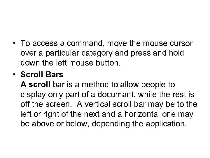 • To access a command, move the mouse cursor over a particular category and press and hold down the left mouse button. • Scroll Bars A scroll bar is a method to allow people to display only part of a documant, while the rest is off the screen. A vertical scroll bar may be to the left or right of the next and a horizontal one may be above or below, depending the application.