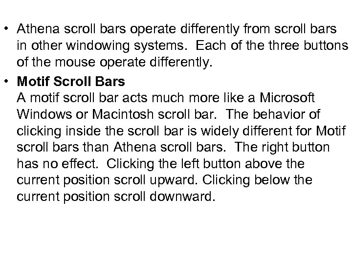 • Athena scroll bars operate differently from scroll bars in other windowing systems. Each of the three buttons of the mouse operate differently. • Motif Scroll Bars A motif scroll bar acts much more like a Microsoft Windows or Macintosh scroll bar. The behavior of clicking inside the scroll bar is widely different for Motif scroll bars than Athena scroll bars. The right button has no effect. Clicking the left button above the current position scroll upward. Clicking below the current position scroll downward.