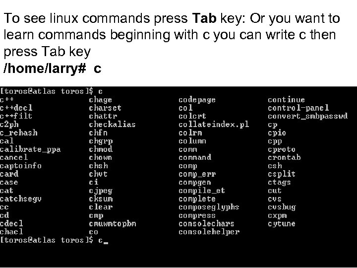 To see linux commands press Tab key: Or you want to learn commands beginning with c you can write c then press Tab key /home/larry# c