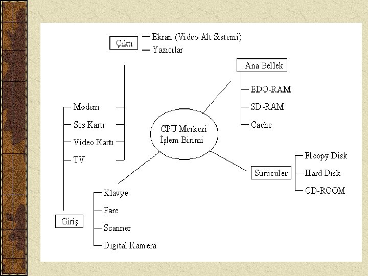 Sistem Parçaları Kasanın içindeki temel parçalar; § § § § § Çıkış Anakart Anabellek (Ram) İşlemci (Cpu) Ekran Kartı Ses Kartı Sabit Disk (Hard disk) CD & Disket Sürücü Modem Güç Kaynağı