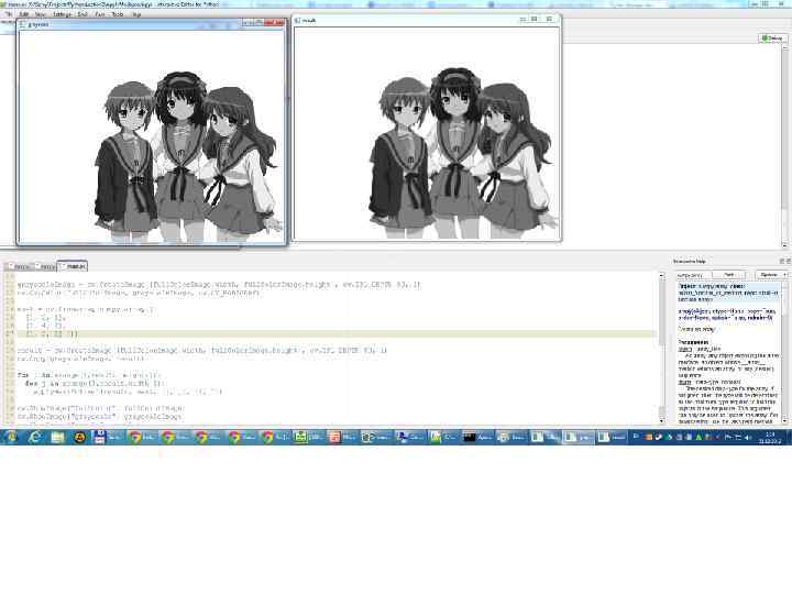 Code time! full. Color. Image = cv. Load. Image(". . /Images/sos-dan. jpg") grayscale. Image = cv. Create. Image((full. Color. Image. width, full. Color. Image. height), cv. IPL_DEPTH_8 U, 1) cv. Cvt. Color(full. Color. Image, grayscale. Image, cv. CV_RGB 2 GRAY) mask = cv. fromarray(numpy. array([ [1, 2, 1], [2, 4, 2], [1, 2, 1] ])) result = cv. Create. Image((full. Color. Image. width, full. Color. Image. height), cv. IPL_DEPTH_8 U, 1) for i in xrange(1, result. height-1): for j in xrange(1, result. width-1): apply. Mask. To. Pixel(grayscale. Image, result, mask, (i, j), (1, 1)) cv. Show. Image("fullcolor", full. Color. Image) cv. Show. Image("grayscale", grayscale. Image) cv. Show. Image("result", result) cv. Wait. Key() cv. Destroy. All. Windows()