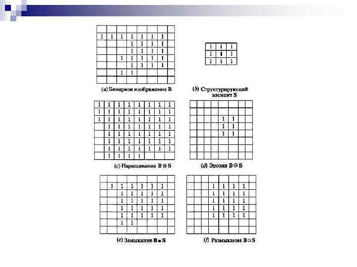 Морфология бинарных изображений Основными операциями бинарной морфологии являются: n наращивание (dilation) n эрозия (erosion) n замыкание (closing) n размыкание (opening)