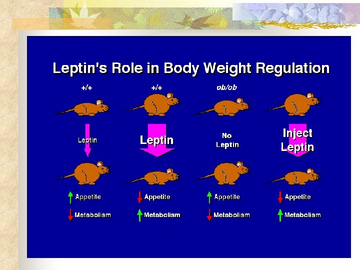 What about humans: n Human fat cells also manufacture leptin protein (167 a. a ) Mutation in gene for leptin or its receptor are rarely found in obese people High blood conc. leptin indicates leptin resistance Extreme obesity in 5 members of two families that are homozygous for mutation in their leptin gene –like ob/ob mice.