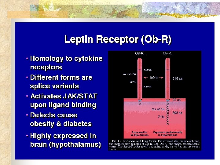 Leptin (OB) 16 KDa protein encoded by ob gene. n Expressed & secreted by – adipocytes, placenta, gastric epithelium. n Directly proportional to the total amount of fat in the body. mice are homozygous for single gene mutation. n ob/ob –protein hormone leptin n db/db –receptor for leptin. High degree of homology