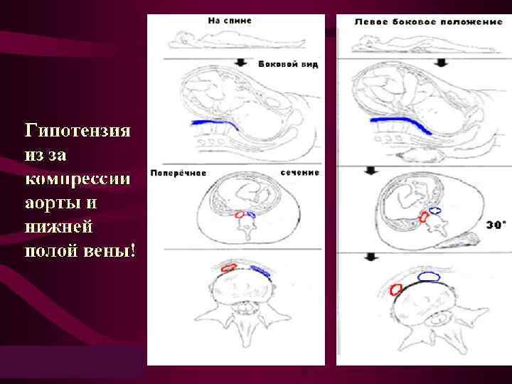 Синдром аорто-кавальной компрессии (нижней полой вены) • Частичное сдавление беременной маткой нижней полой вены с резким падением венозного притока к сердцу при укладывании роженицы на спину. • Быстро возникающая гипотензия, иногда в сочетании с брадикардией, тошнотой рвотой, одышкой при укладывании женщины на спину. • Восстановление исходного АД: поворот роженицы на бок или смещения руками матки в сторону.