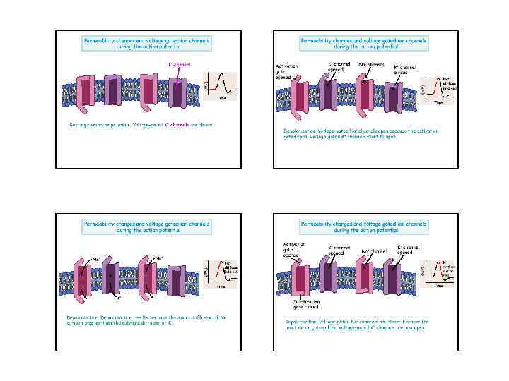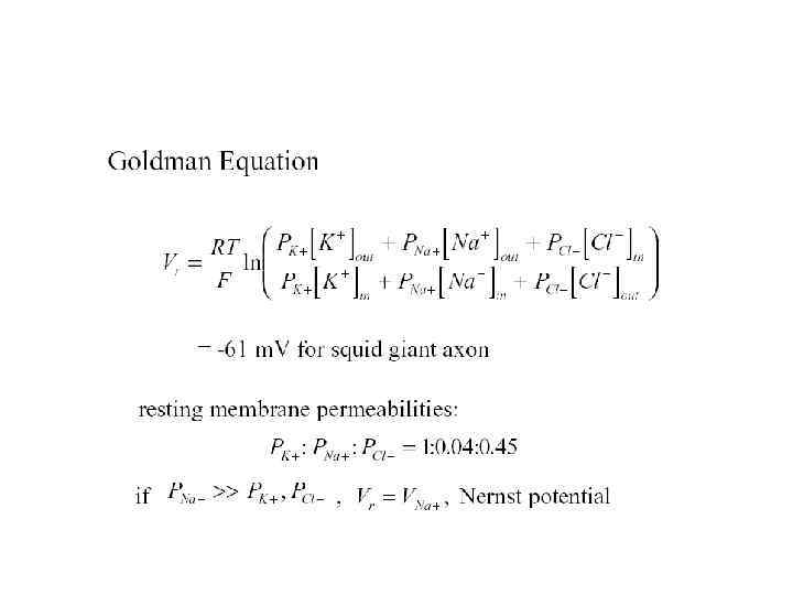 The Goldman Equation • • PK= permeability to K+ ; PNa= permeability to Na+; PCl= permeability to Cl-; [ion]out = ion concentration outside cell; [ion]out = ion concentration outside cell R= Universal gas constant (8. 31 joules/mole/deg. K) T= temperature in degrees Kelvin (273 + o. C) F= Faraday constant (96, 500 Coul/mole) RT/F ~ 25 m. V @ 293 o. K (20 o. C)