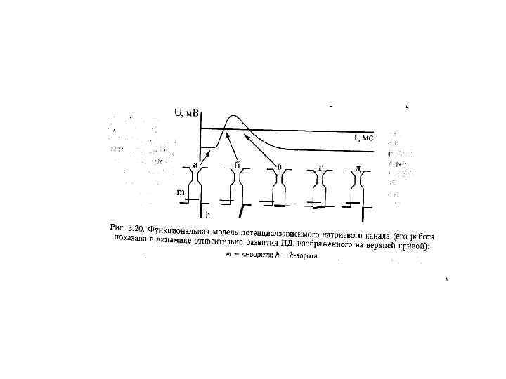 Изменение мембранного потенциала (А), интенсивности калиевого и натриевого трансмембранного тока (Б) и возбудимости клетки (В) в разные фазы потенциала действия. Д – фаза деполяризации, РБ – фаза быстрой реполяризации, РМ – фаза медленной реполяризации, Г – фаза гиперполризации; Н – период нормальной возбудимости, РА – период абсолютной рефрактерности, РО – период относительной рефрактерности, Н+ – период супернормальной возбудимости, Н– – период субнормальной возбудимости.