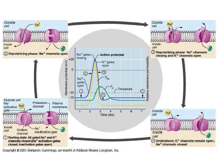 + Sodium (Na ) + • Equilibrium potential for Na in squid giant axon is +54 m. V, but resting membrane potential is -60 m. V • Both diffusion gradient and electrical gradient impel Na+ to enter cell + + • Little Na enters cell because few Na channels open in resting cell. What little does enter pumped back out by Na+ /K+ exchange pump.