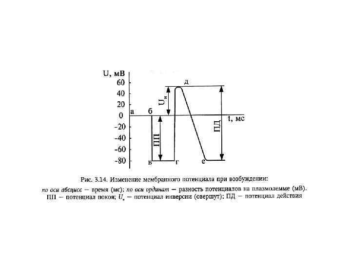 Изменение мембранного потенциала клетки (А) при действии электрического тока различной силы (Б). ЭП - электротонический потенциал, ЛО – локальный ответ, ПД – потенциал действия. ПП П. Покоя Расчет порогового потенциала (ПП): ПП = (критический уровень деполяризации) – (мембранний потенциал покоя).