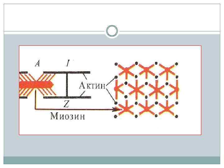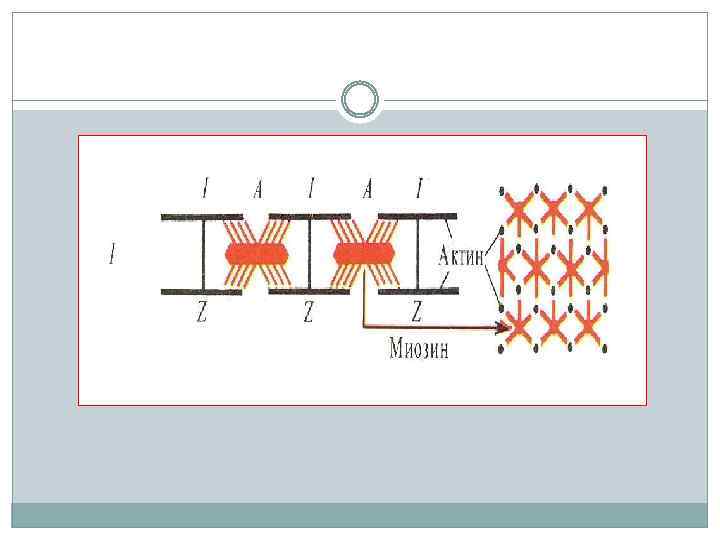 Саркомер — это упорядоченная система толстых и тонких нитей, расположенных гексагонально в поперечном сечении. Толстая нить имеет толщину 12 нм и длину 1, 5 мкм и состоит из белка миозина. Тонкая нить имеет диаметр 8 нм, длину 1 мкм и состоит из белка актина, прикрепленного одним концом к Z-диску.