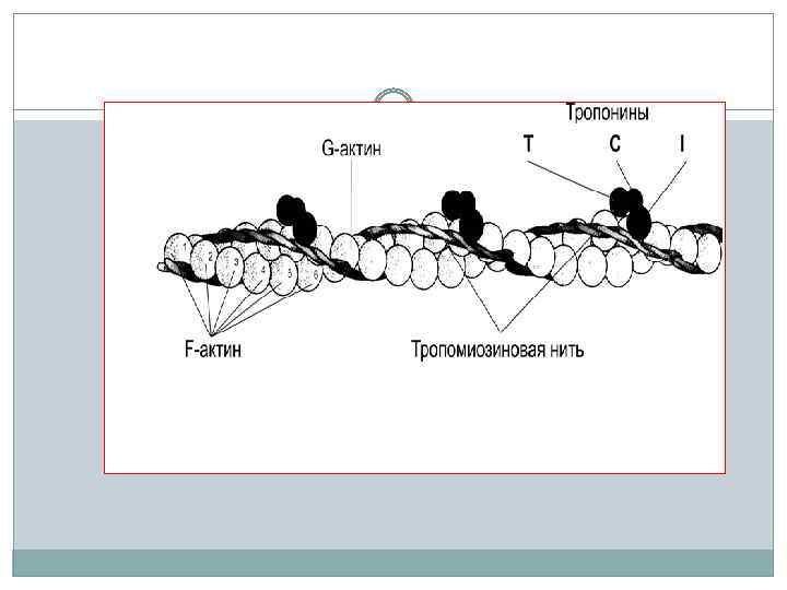 В клетках поперечнополосатых мышц в состав тонких нитей кроме актина и тропомиозина входит еще и белок тропонин. На каждый шаг спирали F-актина приходится две молекулы тропонина.