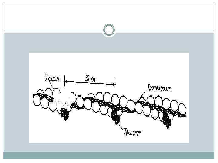 Вдоль спиральных желобков актиновых филаментов (нитей) располагается белок тропомиозин (греч. trope — поворачивать, mys— мышца). Каждая нить тропомиозина, имеющая длину 41 нм, состоит из двух идентичных цепей, вместе закрученных в спираль с длиной витка 7 нм. Вдоль одного витка F-актина расположены две молекулы тропомиозина