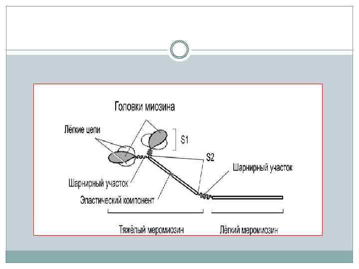 В миозине выделяют два фрагмента: легкий меромиозин (ЛММ) и тяжелый меромиозин (ТММ), между ними находится шарнир. ТММ состоит из двух субфрагментов: S 1, и S 2. , а субфрагмент S 1 выступает над поверхностью. Этот выступающий конец (миозиновая головка) способен связываться с активным центром на актиновой нити и изменять угол наклона к пучку миозиновых нитей