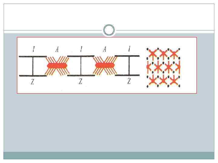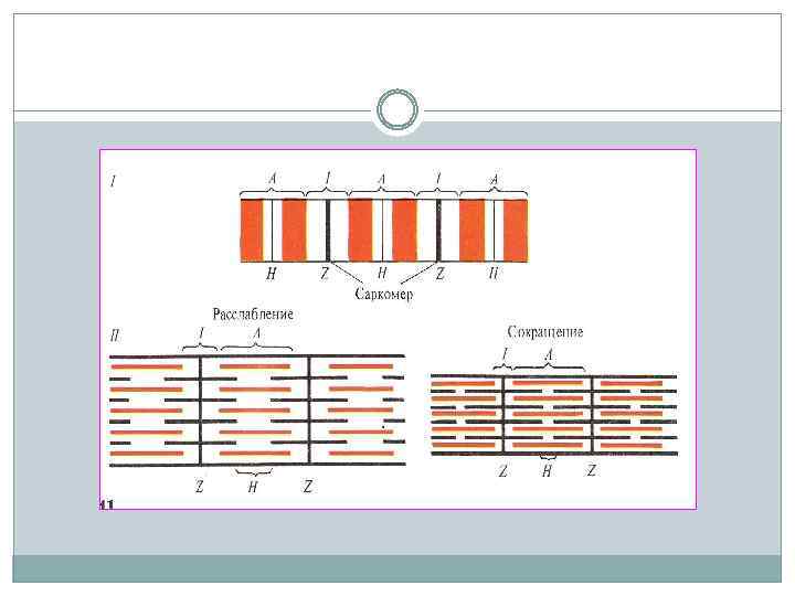 Диск I включает в себя только тонкие нити, диск А — и толстые, и тонкие. В середине диска А видна светлая полоса, называемая Н-зоной. Она не имеет тонких нитей. Диск I разделен тонкой полосой Z, которая представляет собой мембрану, содержащую структурные элементы, скрепляющие между собой концы тонких нитей. Участок между двумя Z-линиями называется саркомером.