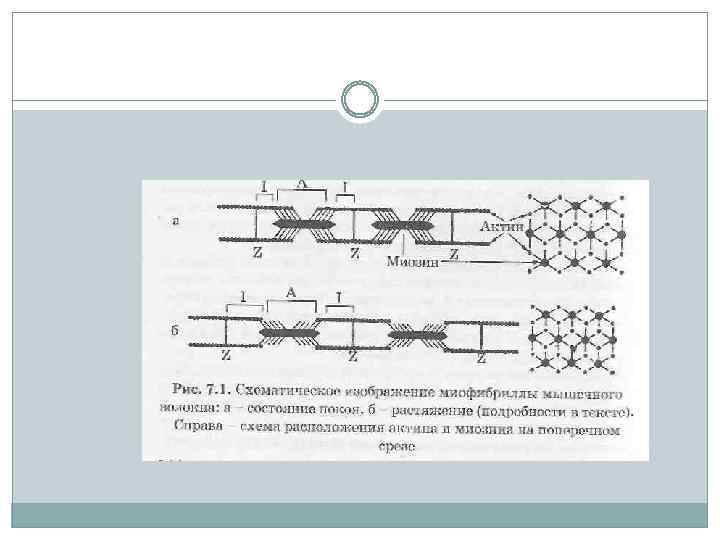 При сокращении мышцы тонкие нити вдвигаются между толстыми. Происходит относительное скольжение нитей без изменения их длины. Этот процесс обусловлен взаимодействием особых выступов миозина — поперечных мостиков с активными Центрами, расположенными на актине. Мостики отходят от толстой нити периодично на расстоянии 14, 5 нм друг от друга