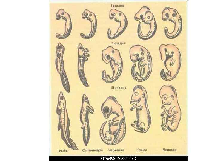 Например, на ранних стадиях развития эмбрионы позвоночных животных не отличаются друг от друга. Лишь на средних стадиях развития у зародышей появляются особенности, характерные для класса, еще позднее отряда, семейства и т. д.