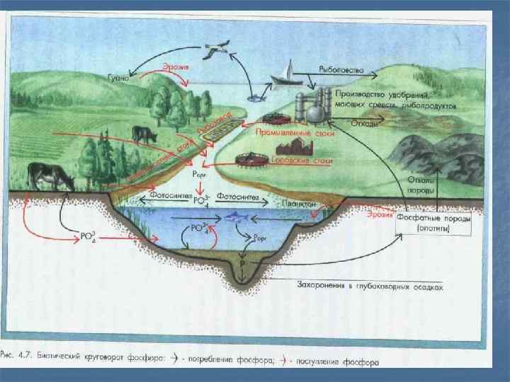 Круговорот фосфора l l Вынос фосфатов на сушу осуществляется в основном с рыбой. Но это не компенсирует их поток с суши в море Механизмы возвращения фосфора в круговорот в природе недостаточно эффективны и не возмещают той его части, которая захоранивается в осадках.