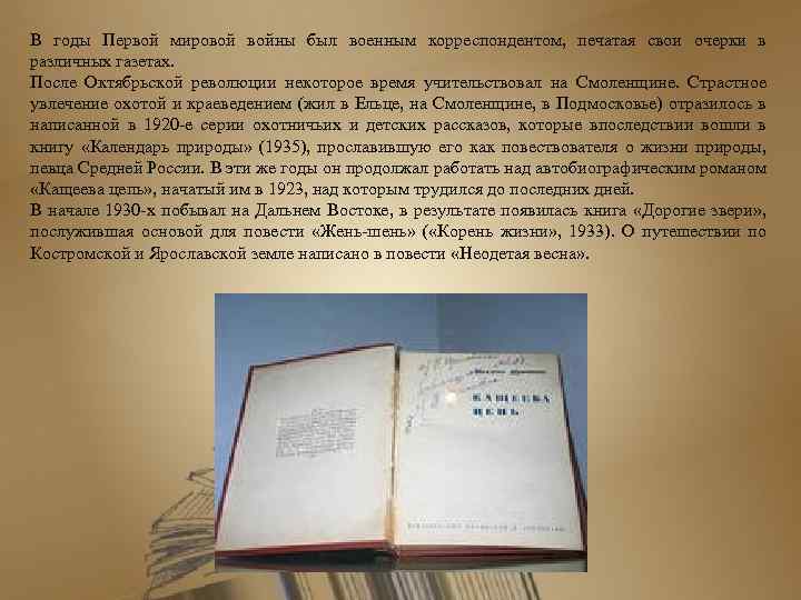 В годы Первой мировой войны был военным корреспондентом, печатая свои очерки в различных газетах. После Октябрьской революции некоторое время учительствовал на Смоленщине. Страстное увлечение охотой и краеведением (жил в Ельце, на Смоленщине, в Подмосковье) отразилось в написанной в 1920 -е серии охотничьих и детских рассказов, которые впоследствии вошли в книгу «Календарь природы» (1935), прославившую его как повествователя о жизни природы, певца Средней России. В эти же годы он продолжал работать над автобиографическим романом «Кащеева цепь» , начатый им в 1923, над которым трудился до последних дней. В начале 1930 -х побывал на Дальнем Востоке, в результате появилась книга «Дорогие звери» , послужившая основой для повести «Жень-шень» ( «Корень жизни» , 1933). О путешествии по Костромской и Ярославской земле написано в повести «Неодетая весна» .