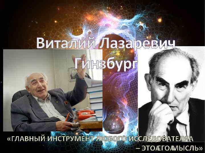 ОБЩЕСТВЕННАЯ ЖИЗНЬ Гинзбург Виталий, биография которого зачаровывает читателей даже после смерти физика, указывает на то, что ученый вел активную общественную жизнь. ØЯвлялся членом комиссии, направленной против бюрократии ØВступил в КПСС в 1944 году Ø В 1955 году подписал «Письмо трехсот» , а через год – петицию, направленную против статей в законодательстве, преследующих «антисоветскую пропаганду и агитацию» . Ø В 1998 году основал Комиссию по борьбе с лженаукой и фальсификацией научных исследований при Президиуме Российской академии наук. Ø Член-корреспондент (1965), действительный член (1969) Международной академии астронавтики. Член Международного астрономического союза (1961).