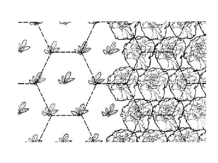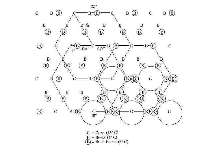 Плотная посадка • Биоинтенсивные грядки не нуждаются в бороздах • Растения размещаются в треугольном порядке. • Расстояния между всеми растениями (их центрами) одинаковое • Когда растения вырастают, их листья касаются листьев других растений, не оставляя пустые места на грядке