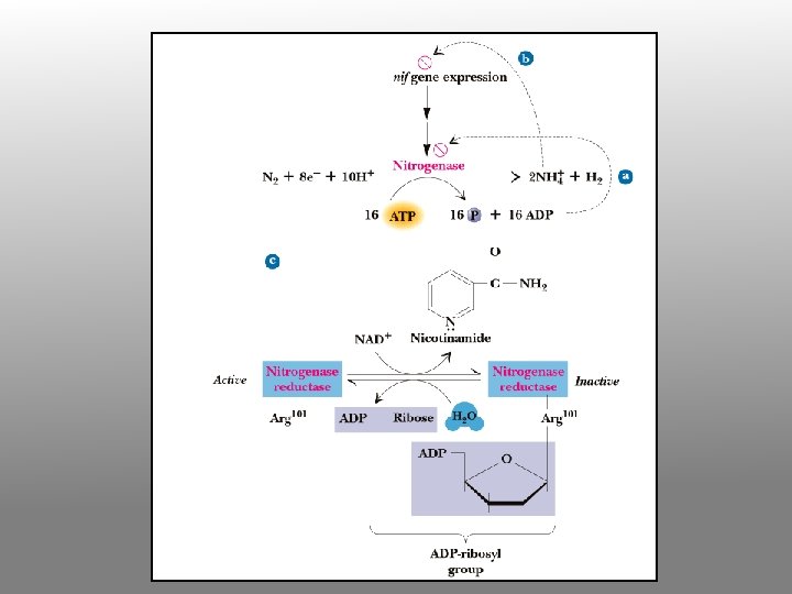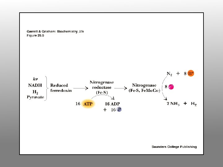 Nitrogenase Complex Two protein components: nitrogenase reductase and nitrogenase • Nitrogenase reductase is a 60 k. D homodimer with a single 4 Fe-4 S cluster • Very oxygen-sensitive • Binds Mg. ATP • 4 ATP required per pair of electrons transferred • Reduction of N 2 to 2 NH 3 + H 2 requires 4 pairs of electrons, so 16 ATP are consumed per N 2