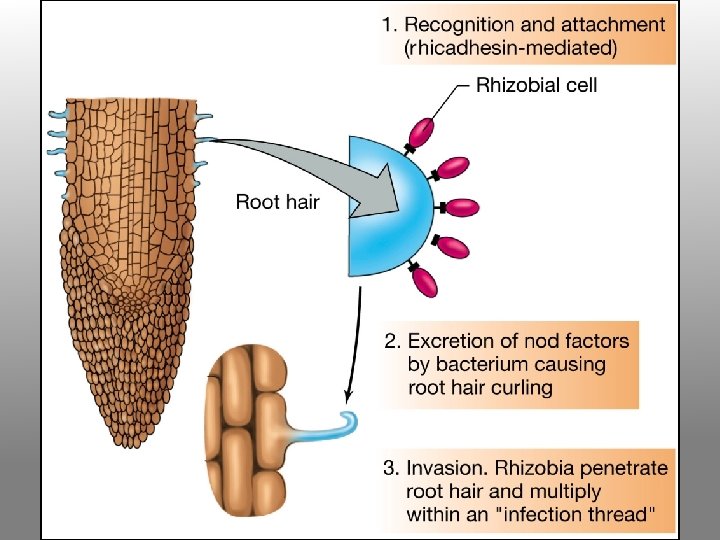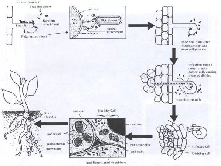 Rhizobium Attachment and infection Nod factor (specificity) Flavonoids (specificity) Invasion through infection tube Bacteroid differentiation Formation of nodule primordia Nitrogen fixation